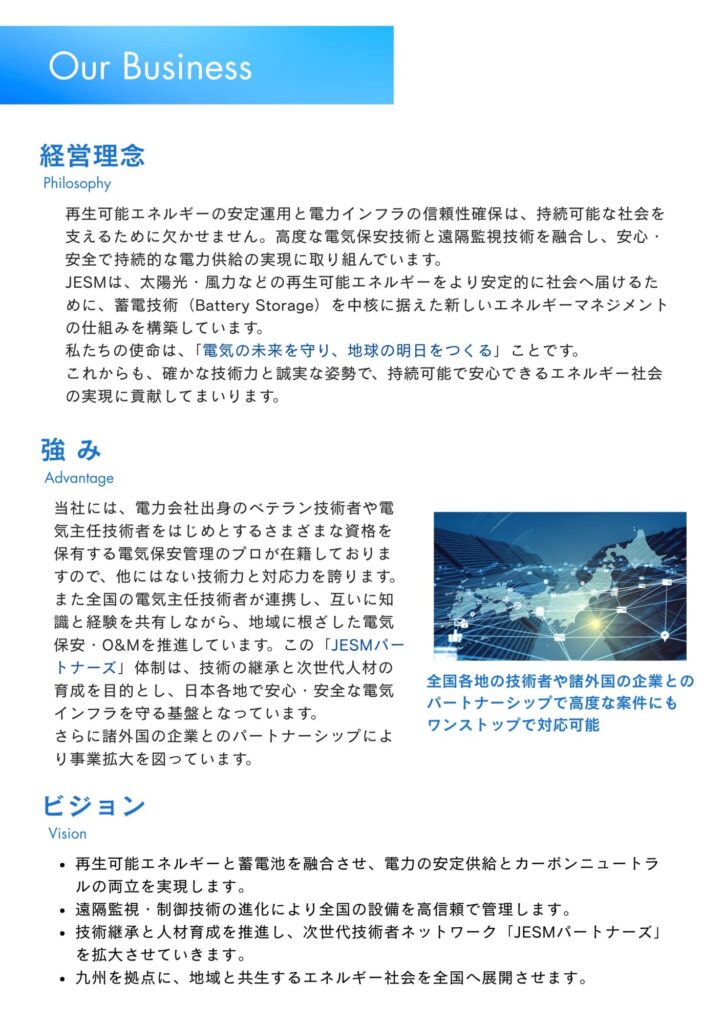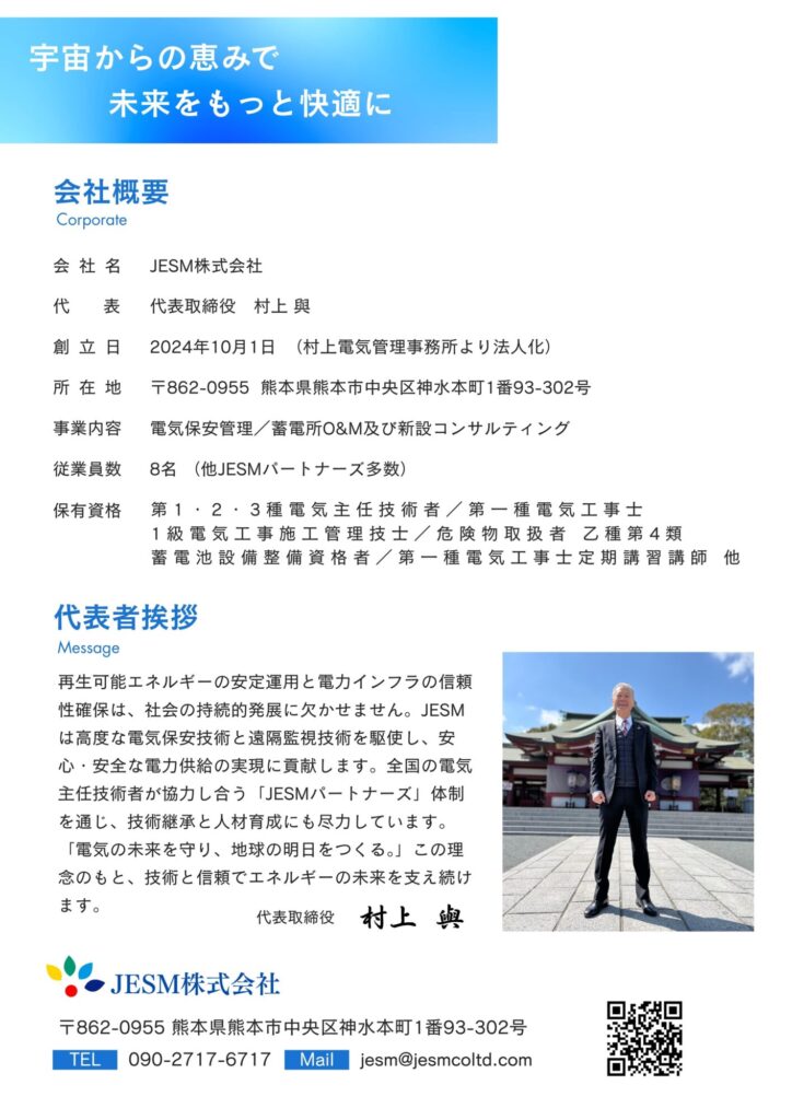 JESM株式会社は、これからも信頼性と誠実さをモットーに、電気の未来を守ってまいります。